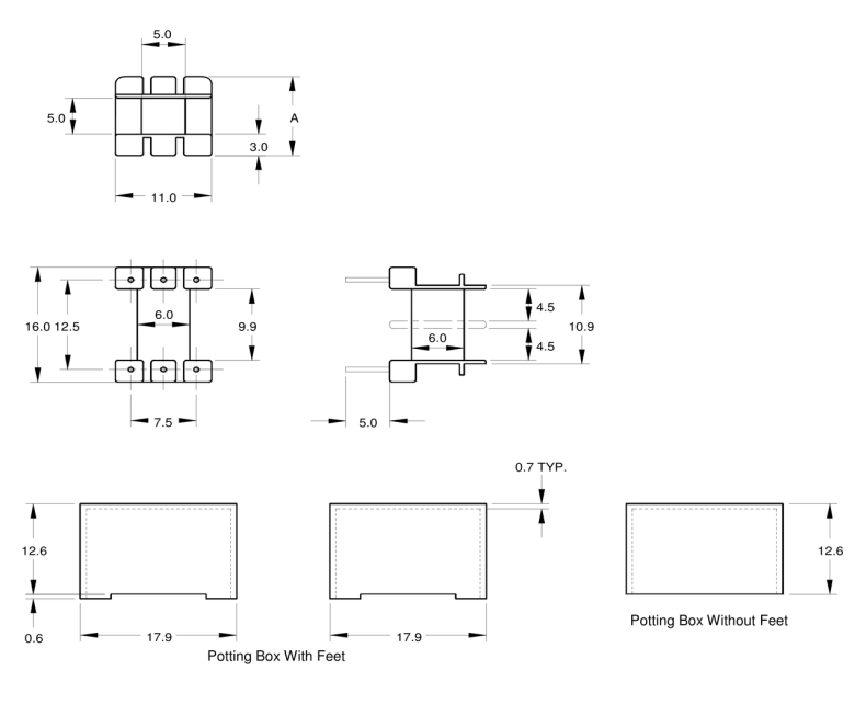 Formers EF16 x 8 x 5 (Hor) Bobbin & Box - 0.6mm diameter round pin - dimensions in millimetres