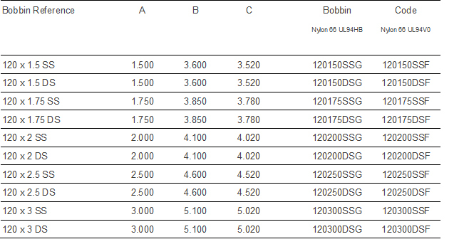 For open end slotted bobbins, replace last but one letter with 'O' (e.g. 120150SOG)