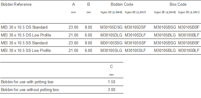 Formers MEI 30 x 10.5 Bobbin - 0.635mm square pin - dimensions in millimetres