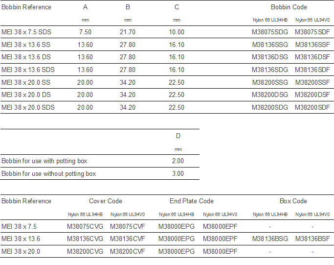 Formers MEI 38 Bobbin - 0.635mm square pin - dimensions in millimetres