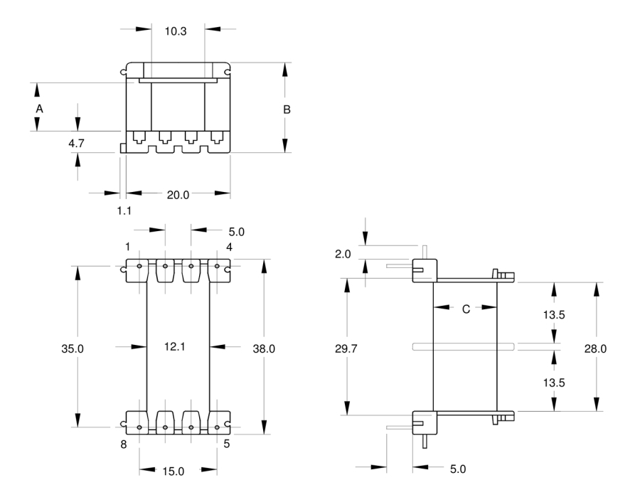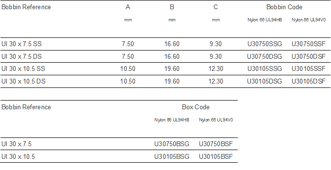Formers UI 30 Bobbin - 0.635mm square pin - dimensions in millimetres